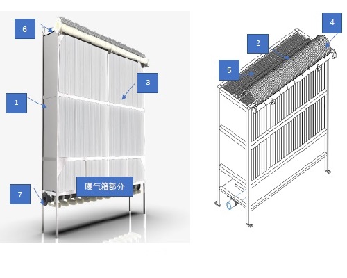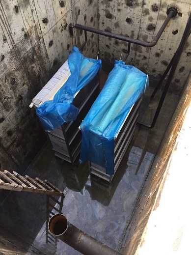 6.安裝膜支架時需做好膜支架、曝氣管的水平安裝,由于平板膜是干式膜片,平板 MBR 組件開始調試時,先使用清水浸泡膜30分鐘,再進行調試。